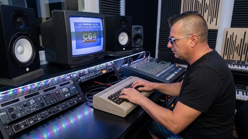 Things get even more fitting when you look inside the studio of RØB VEGA. Because the centerpiece is not some sterile, interchangeable high-end setup designed mainly to look good in promo photos. No — at the center of it all sits a Commodore 64. A machine that already represented digital fascination back in 1986 and today sounds more like retro obsession than modern music production. But that is exactly the point. Or rather, that is exactly where the soul lives.